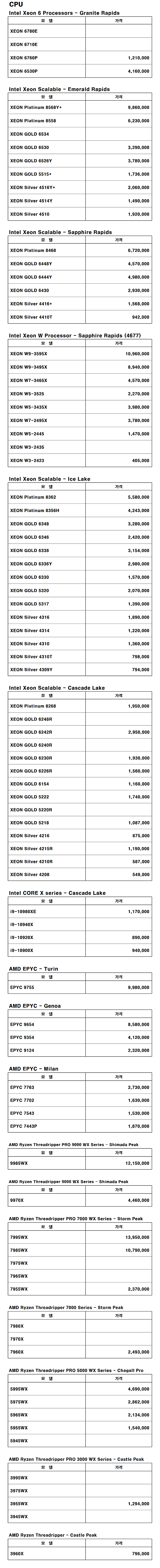 서버 CPU 가격표