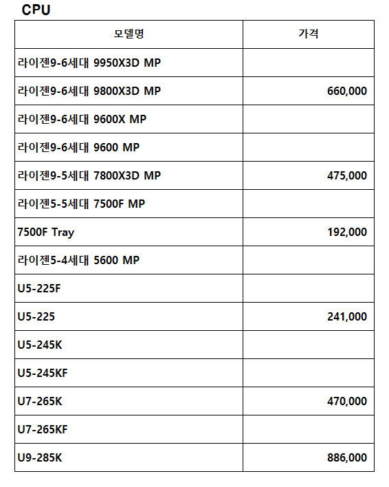 CPU 가격표